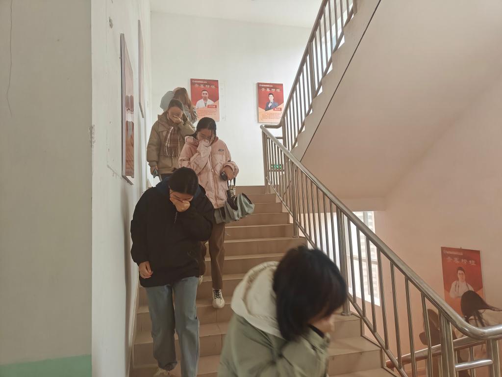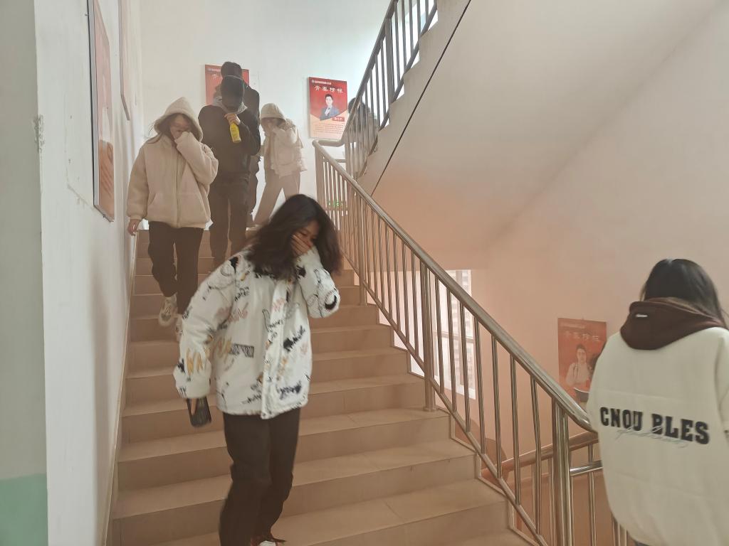 第二部分,應(yīng)急逃生演練(消防、地震)。演練開啟前,安全工作處林澤文老師首先強(qiáng)調(diào)災(zāi)害來臨面前以人為本原則,隨后普及干粉滅火器使用要點(diǎn)。同時(shí)為參演同學(xué)介紹演練程序、疏散信號、疏散路線、疏散順序等注意事項(xiàng),并強(qiáng)調(diào)在疏散過程中切勿擁擠、推搡導(dǎo)致踩踏事件發(fā)生。演練工作組接到演練指令后,模擬燃放煙霧,迅速開啟實(shí)訓(xùn)(驗(yàn))室的安全出口大門,組織學(xué)生依次從實(shí)訓(xùn)(驗(yàn))室撤出,按照指定路線,分別有序從樓梯通道內(nèi)側(cè)撤離,彎腰、捂口鼻、無人喧嘩、迅速有序地撤出實(shí)訓(xùn)(驗(yàn))室,到空曠位置集合并清點(diǎn)人數(shù)。