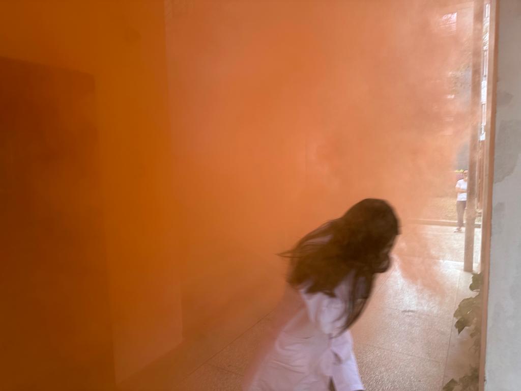 第二部分應(yīng)急逃生演練(消防、地震)。演練開啟前安全工作處林澤文先詳細(xì)介紹消防器材的使用、演練程序、疏散信號、疏散路線、疏散順序等注意事項,并強調(diào)在疏散過程中切勿擁擠、推搡導(dǎo)致踩踏事件發(fā)生。各位置工作人員提前到崗,認(rèn)真履責(zé),確保撤離安全有序。演練開始,安全工作處演練工作組接到演練指令后,模擬燃放煙霧,工作人員組織學(xué)生依次從實訓(xùn)(驗)室撤出,按照指定路線,分別有序從樓梯通道內(nèi)側(cè)撤離,做到彎腰、捂口鼻、迅速有序,到一層大廳集合并清點人數(shù)。