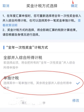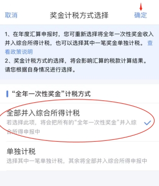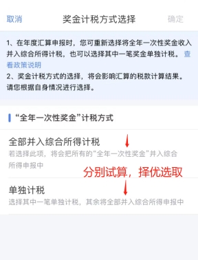點(diǎn)擊“工資薪金”-“全年一次性獎(jiǎng)金”計(jì)稅方式有“全部并入綜合所得計(jì)稅”和“單獨(dú)計(jì)稅”兩種,可以分別試算后,選最優(yōu)方式。