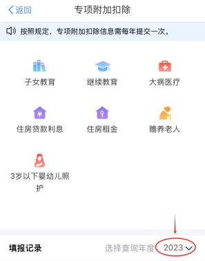 第二步:選擇扣除年度“2023”,再選擇需要填寫(xiě)或修改的專(zhuān)項(xiàng)附加扣除。