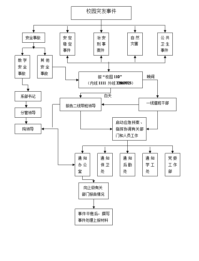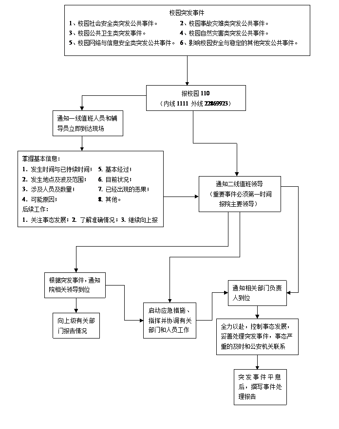 (3)根據(jù)現(xiàn)場情況,一線值班人員,應(yīng)及時了解情況控制事態(tài),視情節(jié)輕重通知相關(guān)處室、系部等人員,有關(guān)人員接到通知應(yīng)立即趕到現(xiàn)場處理事件。