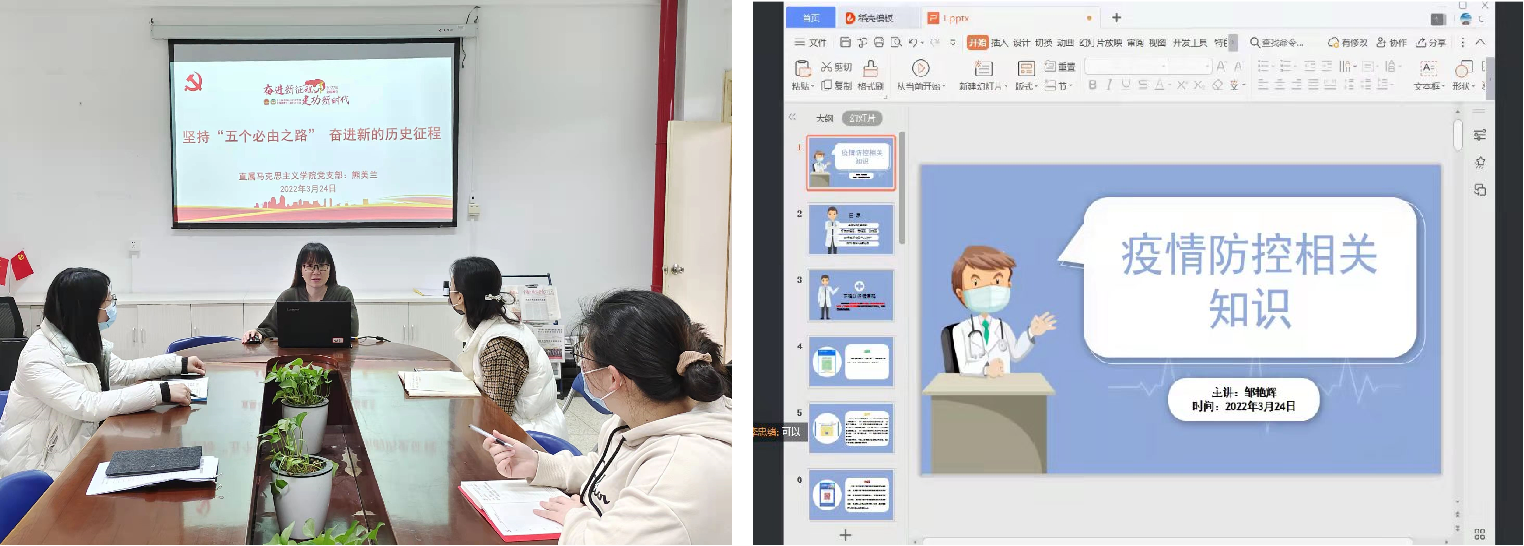 黨員教師們將偉大的抗疫精神融入黨性教育中,將疫情時刻的危機轉(zhuǎn)化為課程思政的契機。直屬馬克思主義學院黨支部書記熊美蘭為全體黨員教師開講《堅持“五個必由之路”奮進新的歷史征程》主題黨課,并通過課程集備,討論在課堂內(nèi)容中充分融入抗疫素材,將抗疫先進事跡和理想信念教育有機融合,同時對學生做好心理疏導和正面引導,鼓勵學生以積極的態(tài)度同心戰(zhàn)“疫”。藥學院第一黨支部結(jié)合疫情防控工作組織線上黨日活動,開展“抗擊疫情 奉獻有我”防疫宣講,并聯(lián)合藥學院團總支舉辦防疫知識競賽送香囊活動,通過活動引導學生樹立“從我做起,積極防疫”的意識,肩負起疫情防控的使命。