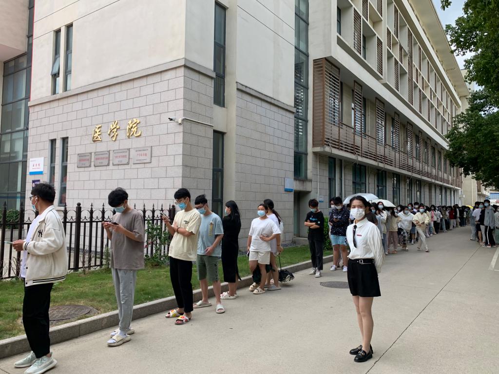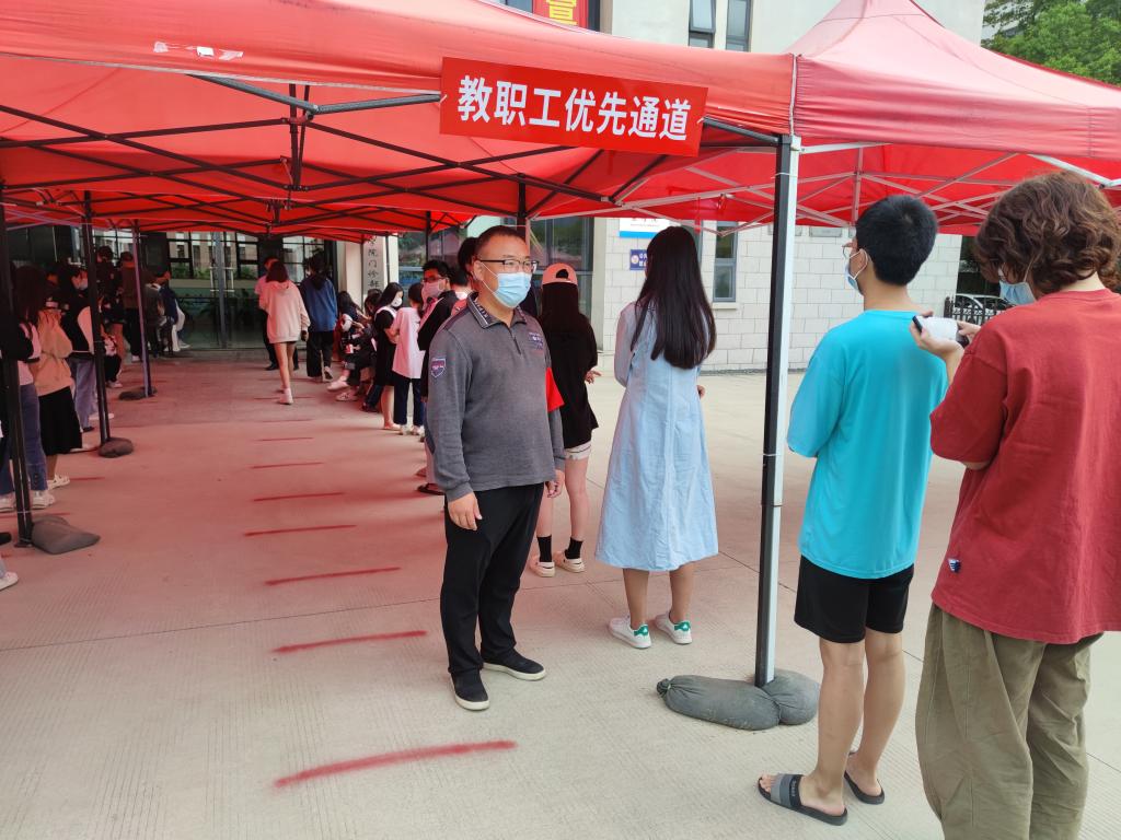 機(jī)關(guān)黨員和輔導(dǎo)員在核酸檢測點(diǎn)維持秩序