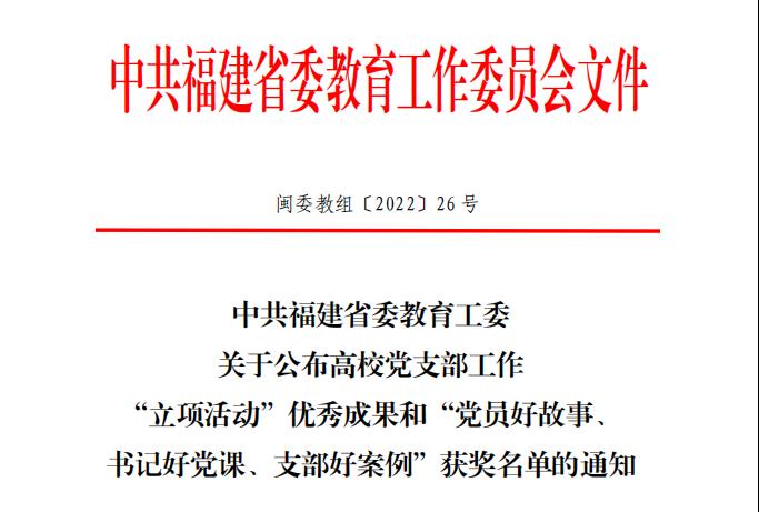 近日,中共福建省委教育工委公布高校黨支部工作“立項(xiàng)活動(dòng)”優(yōu)秀成果和“黨員好故事、書記好黨課、支部好案例”獲獎(jiǎng)名單。我校共有3個(gè)項(xiàng)目入選,其中,黨支部工作“立項(xiàng)活動(dòng)”一、二等獎(jiǎng)各1項(xiàng),“書記好黨課”1項(xiàng)。