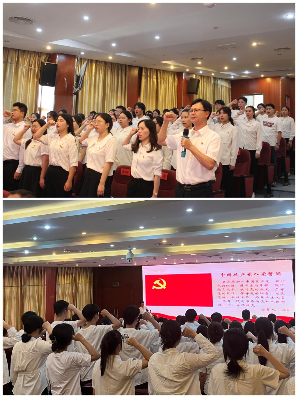 護(hù)理學(xué)院青年教師林曉瓊作為優(yōu)秀共產(chǎn)黨員代表發(fā)言,她結(jié)合自身經(jīng)歷,分享了她在護(hù)理教育和社會(huì)服務(wù)如何用專業(yè)知識(shí)和技能服務(wù)群眾、引領(lǐng)學(xué)生前行,并表示未來(lái)將不忘初心、堅(jiān)守誓言、牢記使命、奮勇向前,為學(xué)校發(fā)展和學(xué)生培養(yǎng)作出更大的貢獻(xiàn)。在公共衛(wèi)生與健康管理學(xué)院黨委書記葉海的帶領(lǐng)下,近五十名新黨員面對(duì)黨旗進(jìn)行了莊嚴(yán)的宣誓,表達(dá)了他們堅(jiān)定不移跟黨走、為共產(chǎn)主義事業(yè)奮斗終身的決心和信念。
