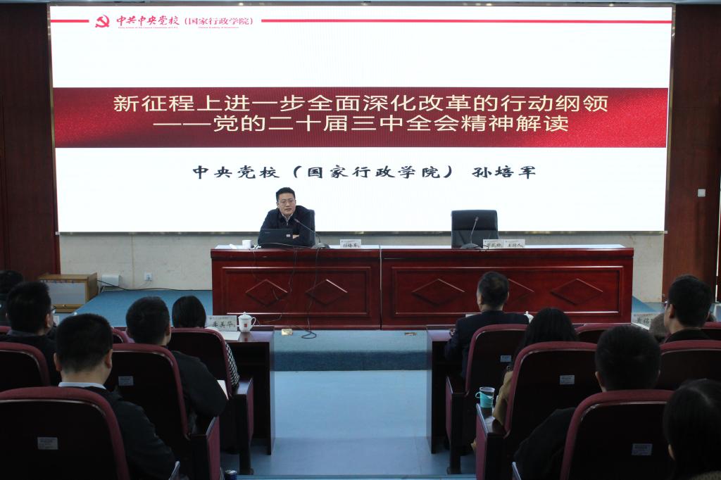 黨的二十屆三中全會是我們黨的歷史上又一個重要里程碑,是進一步全面深化改革、推進中國式現(xiàn)代化的總動員、總部署,深刻回答了在新的歷史條件下舉什么旗、走什么路、改什么、為誰改、怎么改等重大問題,在黨和國家發(fā)展進程中具有極其重大和深遠的歷史意義。為進一步學習貫徹落實黨的二十屆三中全會精神,完整、準確、全面理解《決定》的重大意義、措施要求,切實把全會精神轉化為干事創(chuàng)業(yè)的精氣神、改革創(chuàng)新的源動力,促進學校高質量發(fā)展。12月13日,校黨委理論學習中心組舉行擴大會議,邀請中央黨校孫培軍教授為我們作《新征程上進一步全面深化改革的行動綱領——黨的二十屆三中全會精神解讀》專題輔導報告。會議由校黨委書記曾武祈主持,校領導、副科級以上干部、支部書記、專職組織員、馬克思主義學院全體教師及團學骨干代表共同參加會議。