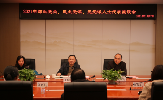 為進一步弘揚習(xí)近平總書記在福建倡導(dǎo)的“四下基層”工作作風(fēng),繼承和發(fā)揚黨的群眾路線優(yōu)良傳統(tǒng),貫徹落實《中國共產(chǎn)黨統(tǒng)一戰(zhàn)線工作條例》,做好2021年統(tǒng)戰(zhàn)工作,加強與黨外人士的聯(lián)系和溝通,聽取師生黨員、黨外人士對學(xué)校改革和發(fā)展的意見和建議,廣泛開展領(lǐng)導(dǎo)干部民主生活會前意見征集,1月7日上午,我校召開師生黨員、民主黨派、無黨派人士代表座談會,校黨委書記曾武祈、院長許能鋒、黨委副書記李美華參加座談會。
