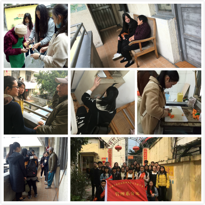 活動期間同學(xué)們不怕苦不怕累,幫助工作人員對公寓內(nèi)的地板、長椅、窗戶、欄桿等公共設(shè)施進行清掃,讓東升公寓有個整潔舒適的環(huán)境。同學(xué)們還與老人談心、拉家常、講笑話逗老人開心,協(xié)助工作人員做午餐,做一些力所能及的事情讓老人們感受到兒孫繞膝般的溫暖和喜悅。最后,同學(xué)們將帶去的水果、面包分發(fā)給老人。在同學(xué)們的陪伴下,老人們露出了開心地笑容,興致勃勃講起他們年輕時的趣事。笑聲頓時打破了以往的寧靜,養(yǎng)老院里充滿了歡聲笑語。