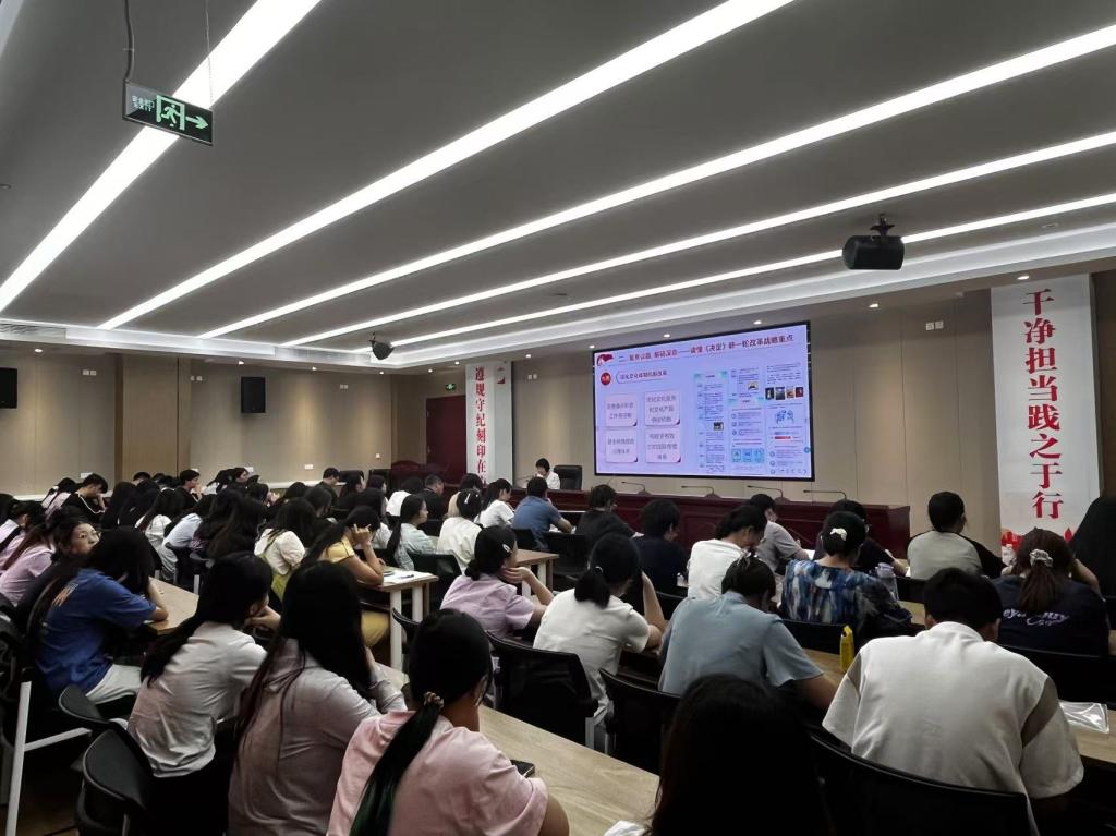 最后通過“展望未來 勇?lián)姑獣鴮懭嫔罨母锏膶嵺`續(xù)篇與時代新篇”激勵師生在新時代新征程上砥礪奮進,奮勇向前。強調,黨的二十屆三中全會精神是一座理論“富礦”,全校師生要持續(xù)發(fā)力、久久為功,在深化內化轉化上下功夫,爭做黨的二十屆三中全會精神的踐行者。希望,師生們要與時代同頻共振,與國家發(fā)展同向同行,把個人成長自覺融入國家發(fā)展大局,為實現(xiàn)中華民族偉大復興的中國夢貢獻青春力量。