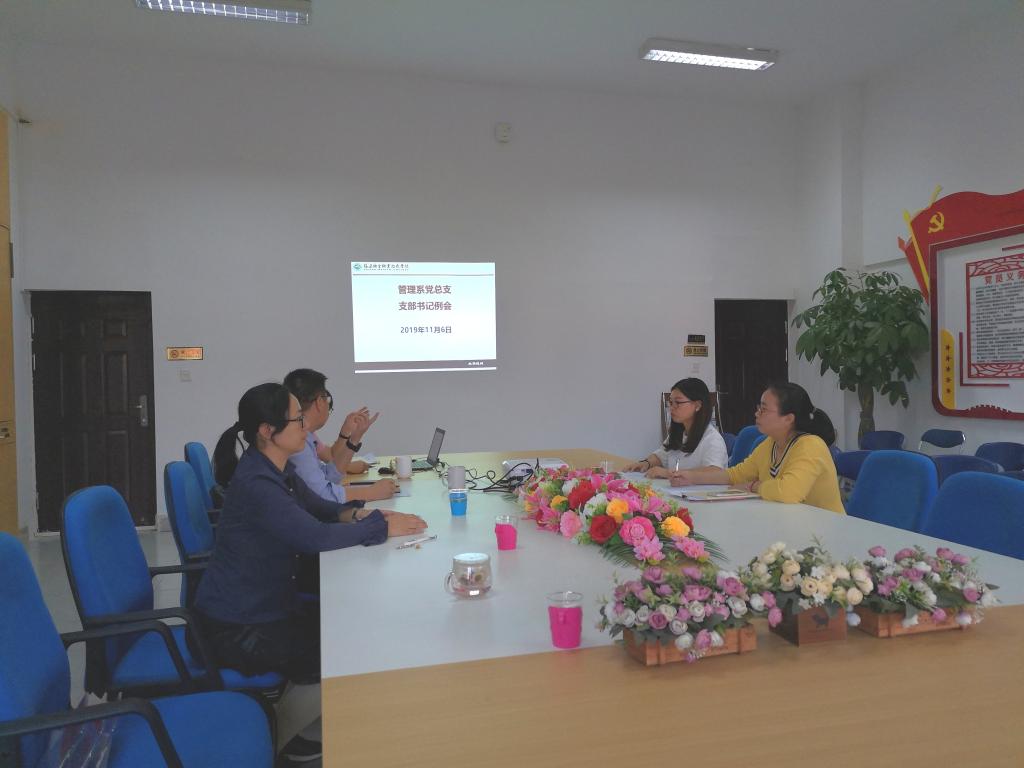 為進(jìn)一步督促、推動(dòng)支部黨建工作順利開(kāi)展,解決工作過(guò)程中的難點(diǎn)問(wèn)題,管理系黨總支于11月6日召開(kāi)支部書(shū)記例會(huì),會(huì)議由系黨總書(shū)記艾松軍主持。管理系黨總支委員、各支部書(shū)記參加會(huì)議。