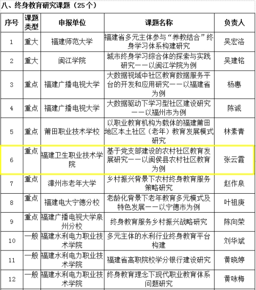 根據(jù)《福建省教育廳福建省財政廳關于開展2018-2020年福建省終身教育重點項目建設工作的通知》(閩教職成〔2018〕36號)文件精神,我系教師黨員張云霞老師積極申報2019年課題項目,所主持的《基于黨支部建設的農(nóng)村社區(qū)教育發(fā)展研究——以閩侯縣農(nóng)村社區(qū)教育為例》課題于近日入選第二批全省終身教育研究重點課題,特此祝賀!