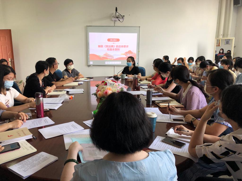 龔海蓉同志結(jié)合自身學習民法典的所思所獲,為全系教職工講授了一堂深入淺出、內(nèi)涵豐富的黨課。她談到,《中華人民共和國民法典》是新中國成立以來第一部以“法典”命名的法律,是新時代我國社會主義法治建設(shè)的重大成果。為幫助大家更好認識、理解民法典,龔海蓉同志從民法典的立法經(jīng)過、編纂民法典的重大意義、編纂民法典的總體要求和基本原則、民法典的主要內(nèi)容以及如何全面學習貫徹民法典等五個方面進行了深入闡釋。結(jié)合個人學習體會,她還指出,從以前的《民法通則》到《民法總則》,再到如今的《民法典》,可以看到的是我國法治的進步、我國法律體系的不斷完善以及法律人們的不懈努力!民法,作為與我們生活最為息息相關(guān)的法律,一套完備的民法體系滿足了新時代人民法治需求、全方位保護了人民民事權(quán)利,是我國法制建設(shè)的一大進步。接著,龔海蓉同志還就民法典的有關(guān)條款進行了解讀,逐條逐項與大家做了交流分享,加深全體教職工對民法典的認識和理解。