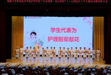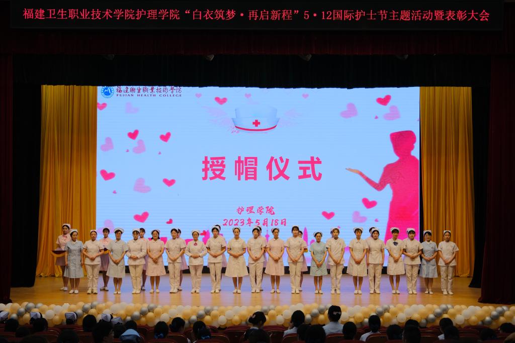 初心與夢想,大愛與感動,在燕尾帽的傳遞中熠熠生輝。為繼承和弘揚南丁格爾不畏艱險、甘于奉獻(xiàn)、救死扶傷、勇于獻(xiàn)身的人道主義精神,5月18日下午,護理學(xué)院在學(xué)術(shù)報告廳舉行“白衣筑夢·再啟新程”5·12國際護士節(jié)主題活動暨表彰大會。福建衛(wèi)生職業(yè)技術(shù)學(xué)院校長許能鋒、省市屬醫(yī)院護理前輩、校團委書記林桂松、校學(xué)生工作部副部長張麗萍、護理學(xué)院領(lǐng)導(dǎo)班子和全體教師以及2021級全體學(xué)生等共計1300余人參加此次活動。