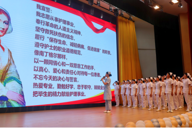 授帽儀式結(jié)束后,護理學(xué)院內(nèi)科護理教研室老師林雅珠帶領(lǐng)學(xué)生在這神圣時刻許下誓言,同學(xué)們舉起右手,鏗鏘誓言指引學(xué)生用崇高的信仰建起生命的方舟,用錚錚誓言表達(dá)不辱白衣天使神圣使命的決心。