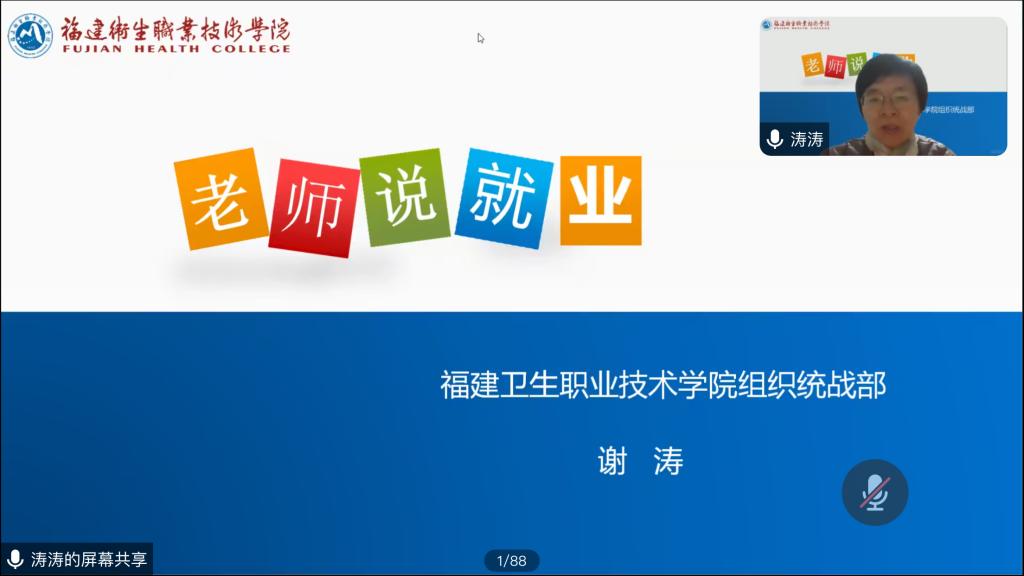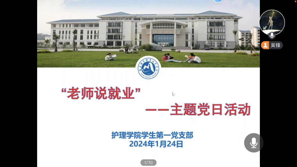 為貫徹落實全國、全省2024屆普通高校畢業(yè)生就業(yè)創(chuàng)業(yè)工作會議精神,幫助畢業(yè)生高質(zhì)量充分就業(yè),切實發(fā)揮黨建引領作用,聚焦解決學生“急難愁盼”問題,1 月24 日,護理學院學生第一黨支部線上開展“老師說就業(yè)”主題黨日活動,本次講座邀請到原護理學院黨總支書記、現(xiàn)任校黨委組織統(tǒng)戰(zhàn)部部長謝濤為護理學院2024屆畢業(yè)生做專題分享,學生第一黨支部書記吳鋒主持會議,護理學院270多位同學線上聆聽。