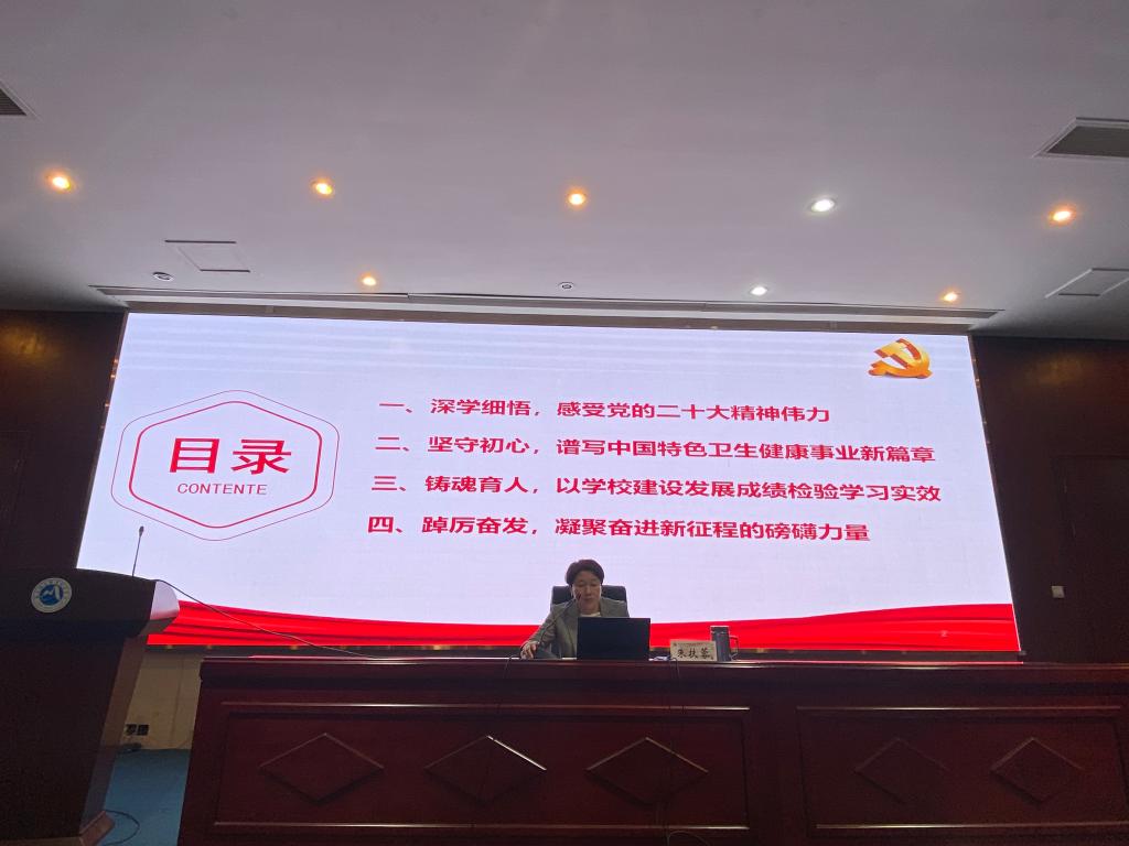 宣講會上,朱扶蓉以《砥礪奮進啟新程 不忘初心鑄輝煌——深入學習貫徹黨的二十大精神》為題,結(jié)合衛(wèi)生健康事業(yè)和學校建設(shè)發(fā)展實際,從深學細悟,感受黨的二十大精神偉力、堅守初心,譜寫中國特色衛(wèi)生健康事業(yè)新篇章、鑄魂育人,以學校建設(shè)發(fā)展成績檢驗學習實效、踔厲奮發(fā),凝聚奮進新征程的磅礴力量等4個方面,通過理論闡釋、事例解讀、數(shù)據(jù)論證等方式,對黨的二十大提出的重要思想、重要觀點、重大戰(zhàn)略、重大舉措,作了全面系統(tǒng)、深入淺出的宣講解讀,報告會精彩生動,現(xiàn)場氣氛熱烈。