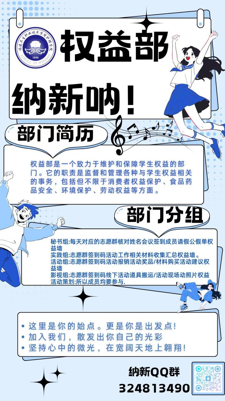 加入學(xué)生會,你將擁有更多的機會參與到學(xué)校的管理和建設(shè)中,為自己的大學(xué)生活增添一抹絢麗的色彩。不要再猶豫了!加入學(xué)生會活動多多,機會多多,各個部門覆蓋你校園學(xué)習(xí)、生活的方方面面,快來掃描二維碼加入我們納新群,多多了解我們吧!期待在9月9日晚上與你相遇!