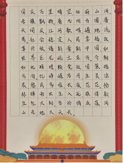 本次書寫比賽分為硬筆組和軟筆組。選手們的書寫或精雕細琢,或揮毫潑墨,或蒼勁有力,或柔美飄逸。但不論是何種風格的書法作品,字里行間都流露出選手們的拳拳愛國心和對祖國繁榮昌盛的美好祝愿。
