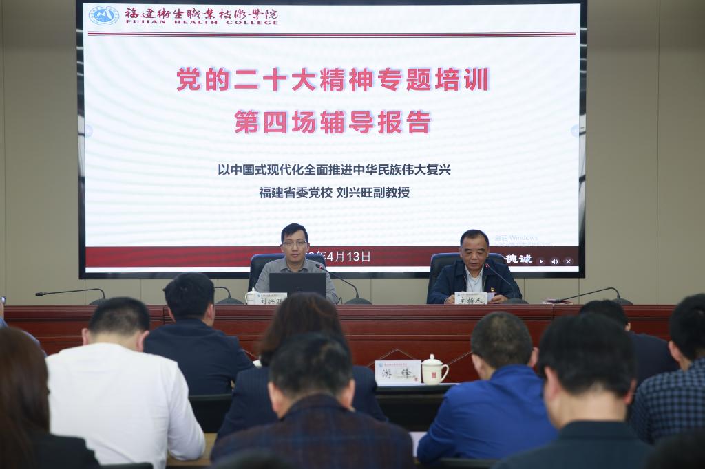 為深入學(xué)習(xí)宣傳貫徹黨的二十大精神,4月13日下午,我校舉行黨的二十大精神專題培訓(xùn)第四次集中學(xué)習(xí),邀請福建省委黨校劉興旺副教授作輔導(dǎo)報告。校領(lǐng)導(dǎo)、中層干部、專職組織員和師生黨支部書記等共80余人參加培訓(xùn)。報告會由紀(jì)委書記游鋒主持。