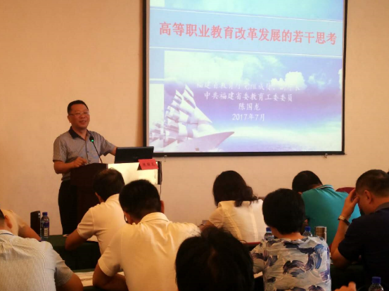 日上午,學(xué)院黨委書記曾武祈主持開班儀式。福建省教育廳黨組成員、副廳長陳國龍同志應(yīng)邀來我院作題為《高等職業(yè)教育改革發(fā)展的若干思考》的專題講座,從我省職業(yè)教育的發(fā)展歷程、改革任務(wù)兩個方面展開,強(qiáng)調(diào)高職院校要堅持需求導(dǎo)向、問題導(dǎo)向、效果導(dǎo)向,努力辦專辦特辦優(yōu),我省將繼續(xù)堅持“補(bǔ)短板、抓內(nèi)涵、創(chuàng)特色、樹品牌”,努力把職業(yè)教育提升到新的水平。