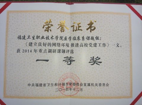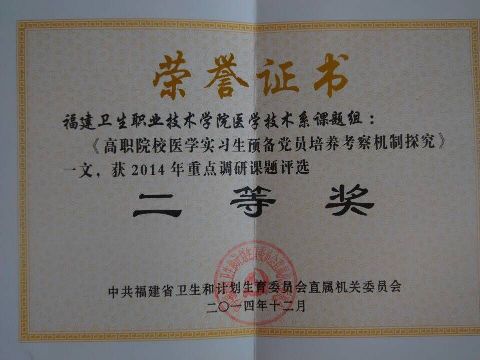 近日,福建省衛(wèi)生和計(jì)劃生育委員會(huì)直屬機(jī)關(guān)委員會(huì)下發(fā)了《關(guān)于表彰2014年重點(diǎn)課題調(diào)研獲獎(jiǎng)?wù)撐牡耐▓?bào)》(閩衛(wèi)委直黨〔2014〕39號(hào)),學(xué)院醫(yī)學(xué)基礎(chǔ)部臨床醫(yī)學(xué)系黨總支課題組調(diào)研成果《建立良好的網(wǎng)絡(luò)環(huán)境 推進(jìn)高校黨建工作》和醫(yī)學(xué)技術(shù)系黨總支課題組調(diào)研成果《高職院校醫(yī)學(xué)實(shí)習(xí)生預(yù)備黨員培養(yǎng)考察機(jī)制探究》分別獲得一等獎(jiǎng)和二等獎(jiǎng)。(黨委工作部)
