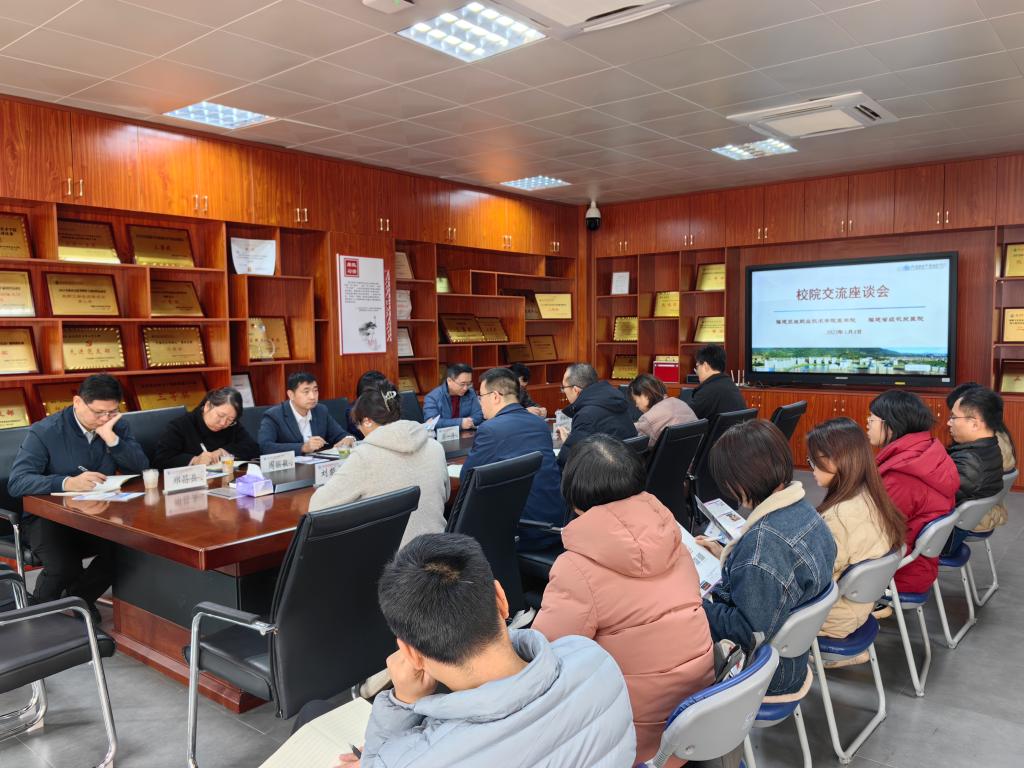 醫(yī)學(xué)院黨委書記傅衍達(dá)對(duì)嚴(yán)金柱一行的到來表示歡迎,醫(yī)學(xué)院院長(zhǎng)鄧元榮從學(xué)院發(fā)展歷程、專業(yè)介紹、師資隊(duì)伍、實(shí)習(xí)實(shí)訓(xùn)條件、人才培養(yǎng)等方面介紹學(xué)校及醫(yī)學(xué)院情況。嚴(yán)金柱介紹了醫(yī)院近年發(fā)展成果、??铺厣⑻岢龊献饕庀颉W剷?huì)上,雙方進(jìn)行深入交流,表示將在黨建共建、教學(xué)管理、專業(yè)建設(shè)、教材編寫、教學(xué)競(jìng)賽、臨床實(shí)踐、健康科普、科學(xué)研究、合作辦學(xué)、創(chuàng)新比賽等方面密切合作,盡快盡早落實(shí)落地,實(shí)現(xiàn)醫(yī)教融合促發(fā)展,培養(yǎng)高質(zhì)量醫(yī)學(xué)人才。