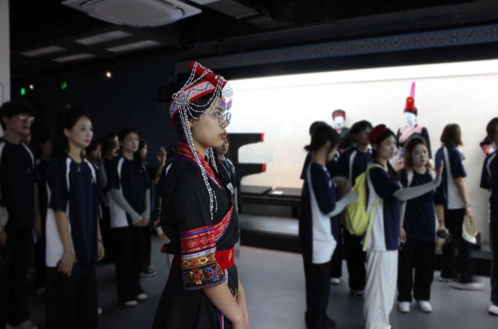 實(shí)踐隊(duì)先來到畬族文化中心參觀,隊(duì)伍中一位畬族隊(duì)員特意換上了本民族的傳統(tǒng)服飾:黑色的衣料上點(diǎn)綴著鮮亮的彩色刺繡,或是靈動(dòng)的花鳥圖案,或是寓意吉祥的傳統(tǒng)紋樣,在館內(nèi)柔和的光線中顯得格外雅致。作為畬族兒女,她看著館內(nèi)陳列的畬族文物、圖文資料時(shí),眼中滿是親切與認(rèn)同,靜靜駐足的身影與周圍的文化展品相映,仿佛是民族文化傳承的一個(gè)生動(dòng)縮影,也為之后走進(jìn)民族中學(xué),與各族學(xué)生交流埋下了共鳴的伏筆。