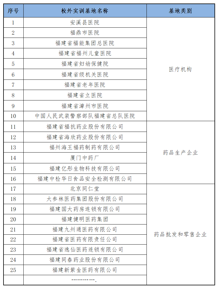 藥學(xué)專(zhuān)業(yè)擁有配備設(shè)施先進(jìn)、條件完善的中央財(cái)政支持的校內(nèi)實(shí)訓(xùn)基地,由藥物制劑實(shí)訓(xùn)車(chē)間、藥劑實(shí)驗(yàn)室、藥物化學(xué)實(shí)驗(yàn)室、藥物分析實(shí)驗(yàn)室、精密儀器中心、模擬藥房、模擬藥店、機(jī)能學(xué)實(shí)訓(xùn)室等組成。擁有福建省立醫(yī)院、福建同春藥業(yè)股份有限公司、福州海王福藥制藥有限公司等76家醫(yī)藥衛(wèi)生單位和社會(huì)藥店校外實(shí)訓(xùn)基地,滿(mǎn)足藥學(xué)專(zhuān)業(yè)認(rèn)識(shí)實(shí)習(xí)、崗位實(shí)習(xí)等教學(xué)要求。