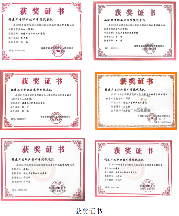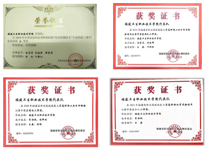 本專(zhuān)業(yè)積極組織學(xué)生參加各級(jí)各類(lèi)職業(yè)院校技能大賽,近五年共獲得化學(xué)實(shí)驗(yàn)技術(shù)競(jìng)賽一等獎(jiǎng)1項(xiàng),二等獎(jiǎng)2項(xiàng),三等獎(jiǎng)2項(xiàng)。藥學(xué)技能競(jìng)賽一等獎(jiǎng)2項(xiàng)、二等獎(jiǎng)1項(xiàng)。