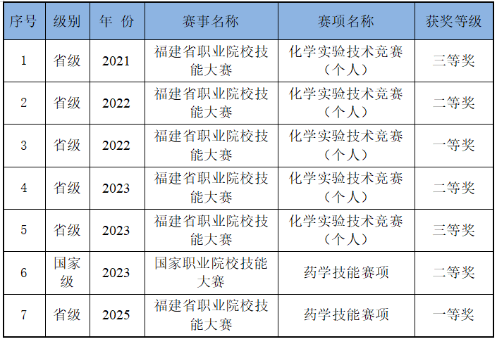 2008年藥學(xué)(生物制藥)實(shí)訓(xùn)基地被列入中央財(cái)政支持的高等職業(yè)教育實(shí)訓(xùn)基地建設(shè)項(xiàng)目,2009年藥學(xué)專(zhuān)業(yè)被評(píng)為省級(jí)精品專(zhuān)業(yè),2013年藥學(xué)專(zhuān)業(yè)被評(píng)為省級(jí)示范專(zhuān)業(yè)。教師承擔(dān)的全國(guó)衛(wèi)生職業(yè)教育研究發(fā)展基金重點(diǎn)課題《基于工學(xué)結(jié)合的高職藥學(xué)專(zhuān)業(yè)職業(yè)技能標(biāo)準(zhǔn)及配套實(shí)訓(xùn)教材開(kāi)發(fā)與應(yīng)用研究》成果獲2014年福建省職業(yè)教育教學(xué)成果獎(jiǎng)一等獎(jiǎng),2016年與福州海王福藥制藥有限公司合作獲首批“二元制”技術(shù)技能人才培養(yǎng)改革試點(diǎn)項(xiàng)目。以藥學(xué)專(zhuān)業(yè)為建設(shè)重點(diǎn)的藥學(xué)專(zhuān)業(yè)群2016年獲批“福建省職業(yè)院校服務(wù)產(chǎn)業(yè)特色專(zhuān)業(yè)群建設(shè)項(xiàng)目”,2016年藥學(xué)專(zhuān)業(yè)獲批“首批全國(guó)職業(yè)院校健康服務(wù)類(lèi)示范專(zhuān)業(yè)點(diǎn)”,2017年獲批“省級(jí)專(zhuān)業(yè)群實(shí)訓(xùn)基地建設(shè)B類(lèi)項(xiàng)目”,《中藥學(xué)、藥學(xué)專(zhuān)業(yè)校企協(xié)同培養(yǎng)技術(shù)技能型人才培養(yǎng)模式的探索與實(shí)踐》,被教育廳認(rèn)定為2017年教學(xué)成果一等獎(jiǎng)。 “伏立諾他原料及其膠囊劑的開(kāi)發(fā)”項(xiàng)目獲2017年福建省醫(yī)學(xué)科技獎(jiǎng)三等獎(jiǎng)。2021年藥學(xué)專(zhuān)業(yè)群入選福建省高水平專(zhuān)業(yè)群立項(xiàng)建設(shè)項(xiàng)目。