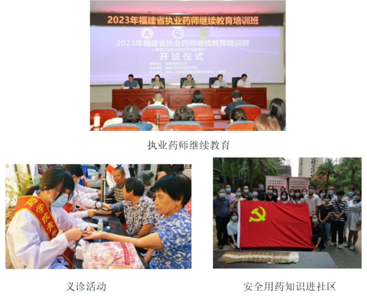 積極承擔(dān)社會(huì)服務(wù)功能,面向社會(huì)、行業(yè)、醫(yī)院(企業(yè))開(kāi)展技術(shù)技能培訓(xùn)。協(xié)助學(xué)校繼續(xù)教育中心承擔(dān)福建省執(zhí)業(yè)藥師繼續(xù)教育培訓(xùn)班。依托黨支部開(kāi)展社會(huì)實(shí)踐活動(dòng)及團(tuán)總支志愿服務(wù)隊(duì)開(kāi)展義診志愿服務(wù)。專(zhuān)業(yè)教師利用專(zhuān)業(yè)知識(shí),開(kāi)展橫向課題和成果轉(zhuǎn)化,提升科技服務(wù)能力,部分科研成果實(shí)現(xiàn)轉(zhuǎn)讓收益。