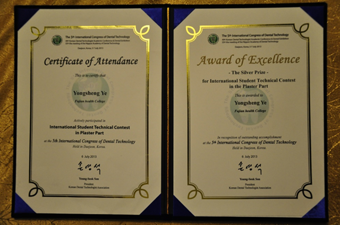 學(xué)生獲第五屆國際口腔技師學(xué)術(shù)大會(韓國)口腔醫(yī)學(xué)技術(shù)專業(yè)石膏牙雕刻銀獎