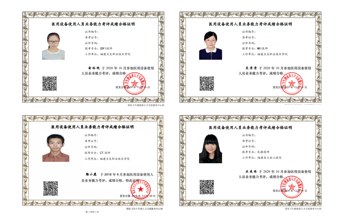 學生畢業(yè)頒發(fā)福建省教育廳統(tǒng)一印制、國家教育部電子注冊的??飘厴I(yè)證書,可考取放射人員工作證、CT技師、MRI技師、CDFI技師等證書;“放療班”可另獲取放射治療技術方向證書。