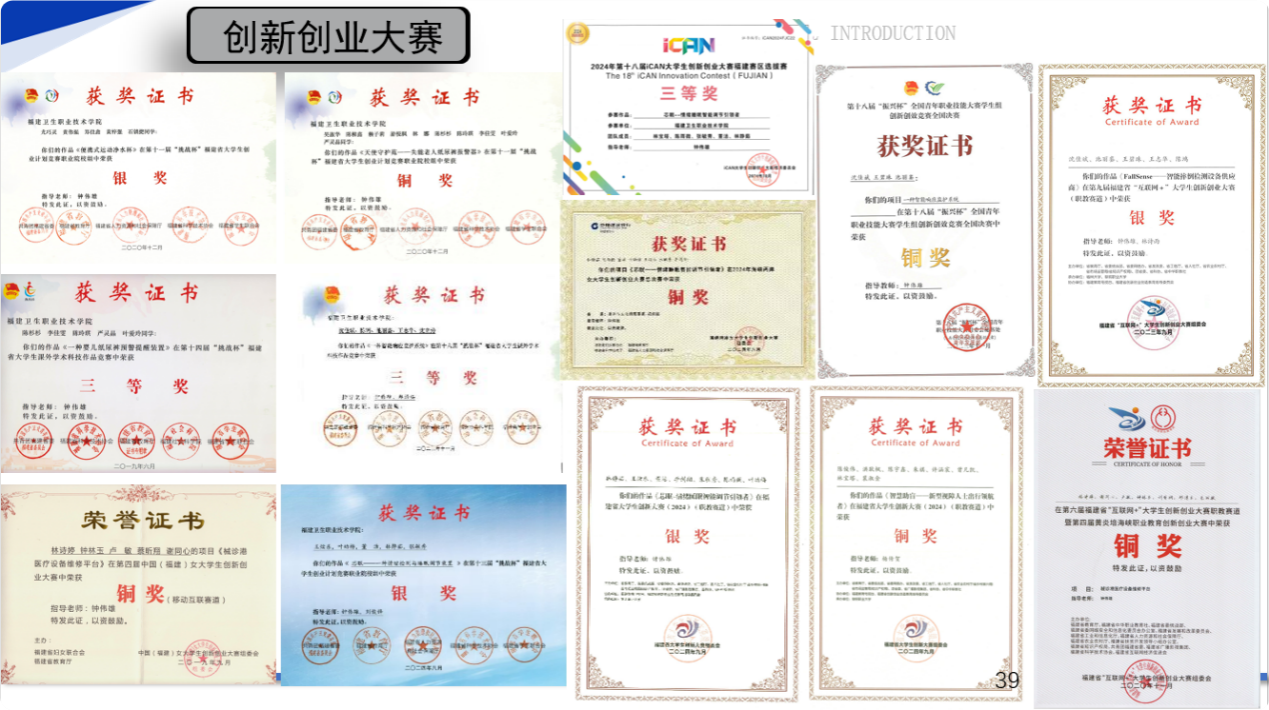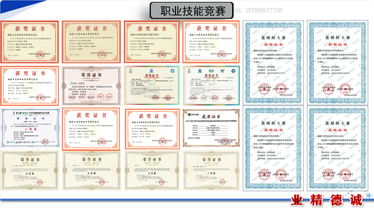 學(xué)生獲得全國醫(yī)用電子儀器技術(shù)職業(yè)技能大賽個人二等獎1項、個人三等獎1項、團體三等獎2項,2022-2023“一帶一路”暨金磚國家技能發(fā)展與技術(shù)創(chuàng)新大賽一等獎和最佳組織獎1項,第十八屆“振興杯”全國青年職業(yè)技能大賽學(xué)生組創(chuàng)新創(chuàng)效競賽全國決賽銅獎1項,福建省職業(yè)院校技能大賽集成電路開發(fā)及應(yīng)用賽項二等獎3項、三等獎1項,福建省職業(yè)院校技能大賽物聯(lián)網(wǎng)技術(shù)應(yīng)用賽項三等獎2項、福建省職業(yè)院校技能大賽智能電子產(chǎn)品設(shè)計與開發(fā)賽項二等獎1項、福建省第二屆國銳杯增材制造技術(shù)綜合應(yīng)用技能大賽三等獎1項,“挑戰(zhàn)杯”福建省大學(xué)生課外學(xué)術(shù)作品競賽三等獎2項,“挑戰(zhàn)杯”福建省大學(xué)生創(chuàng)業(yè)計劃競賽銀獎2項、銅獎1項,福建省“互聯(lián)網(wǎng)+”大學(xué)生創(chuàng)新創(chuàng)業(yè)大賽銀獎1項、銅獎1項,中國(福建)女大學(xué)生創(chuàng)新創(chuàng)業(yè)大賽銅獎1項、福建省大學(xué)城創(chuàng)新大賽(2024)銀獎1項、銅獎1項,2022一帶一路暨金磚國家技能發(fā)展與技術(shù)創(chuàng)新大賽浙區(qū)域賽二等獎、海峽兩岸大學(xué)生職業(yè)技能大賽物聯(lián)網(wǎng)技術(shù)應(yīng)用賽項三等獎2項、智能硬件開發(fā)與應(yīng)用一等獎1項、二等獎1項。碼蹄杯全國大學(xué)生程序設(shè)計大賽職業(yè)院校賽道省賽金獎1項、銅獎4項、第十五屆藍(lán)橋杯全國軟件和信息技術(shù)專業(yè)人才大賽福建賽區(qū)Python程序設(shè)計三等獎2項、物聯(lián)網(wǎng)設(shè)計與開發(fā)大學(xué)組三等獎1項、單片機設(shè)計與開發(fā)職業(yè)院校組三等獎1項。學(xué)生參與教師科研,獲國家專利2項,國家計算機軟件著作權(quán)證書4項。
