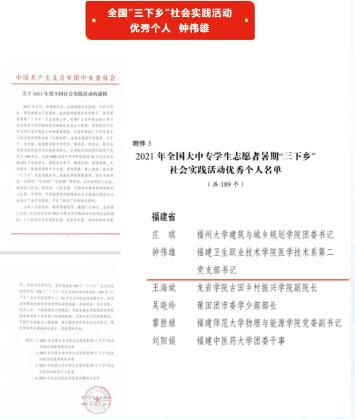 專業(yè)教師2021年研發(fā)“一種便攜式超聲診斷儀”申報國家發(fā)明專利(專利號:202010734371.8),組建“醫(yī)+紅夢隊”學(xué)生團隊,參加2021年暑期“三下鄉(xiāng)”社會實踐活動,深入福建三明尤溪,為村民帶去義診關(guān)愛。