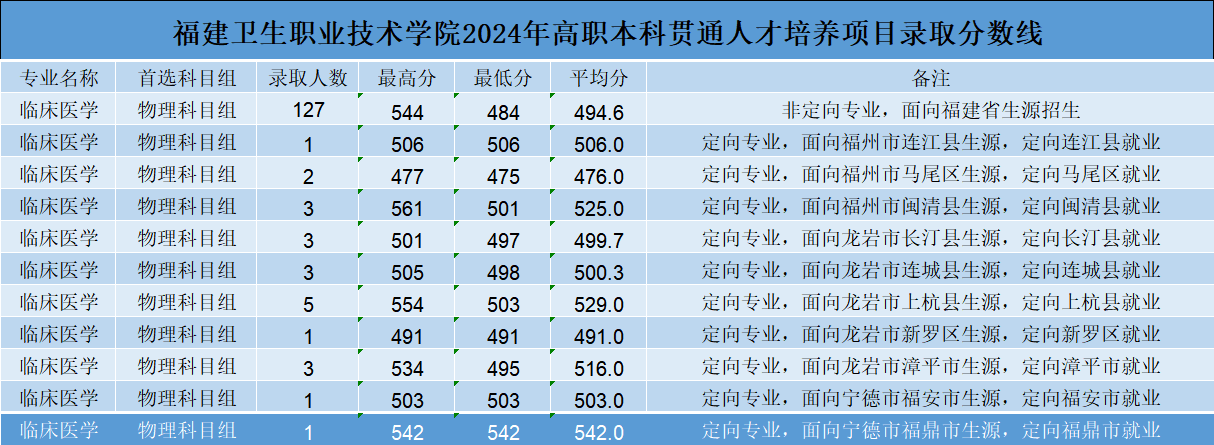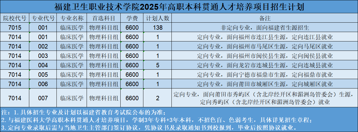 臨床醫(yī)學(xué)專業(yè)“3+3”高職本科貫通人才培養(yǎng)項(xiàng)目由福建衛(wèi)生職業(yè)技術(shù)學(xué)院與福建醫(yī)科大學(xué)聯(lián)辦,培養(yǎng)臨床醫(yī)學(xué)應(yīng)用型本科人才。我校自2021年在福建省內(nèi)首創(chuàng)該項(xiàng)目,至今已連續(xù)招生4屆。項(xiàng)目充分融合兩校的醫(yī)學(xué)人才培養(yǎng)理念、師資隊(duì)伍、實(shí)訓(xùn)實(shí)習(xí)資源等辦學(xué)優(yōu)勢,采取高職-本科貫通的人才培養(yǎng)模式,聯(lián)合培養(yǎng)臨床全科醫(yī)學(xué)專業(yè)人才,學(xué)制為“3+3”年(高職階段3年+本科階段3年)。2025年面向福建省招生計(jì)劃數(shù)為150人(包括定向生12人,非定向生138人)。定向生轉(zhuǎn)段成功進(jìn)入本科階段學(xué)習(xí),順利畢業(yè)后還能夠入編入崗包就業(yè),在校期間還有學(xué)費(fèi)補(bǔ)助等。本項(xiàng)目在福建省高職(??疲┡武浫?,常規(guī)志愿和征求志愿均實(shí)行專業(yè)平行志愿投檔的錄取模式。