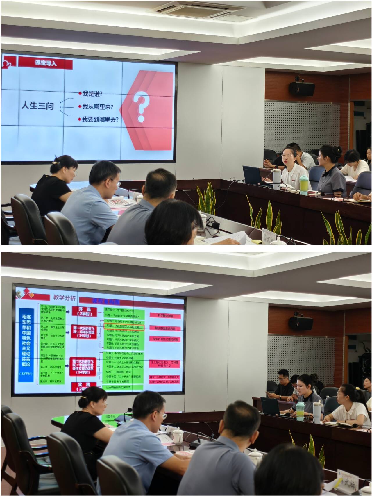 集備會(huì)上,顏冰鳳老師圍繞《思想道德與法治》課程專題二“領(lǐng)悟人生真諦 把握人生方向”進(jìn)行教學(xué)展示。她以“人生三問”搭建邏輯框架,設(shè)置問題鏈層層追問,引導(dǎo)學(xué)生自主思考;以福建特色案例與閩衛(wèi)青年的校本案例觸動(dòng)學(xué)生情感,推動(dòng)價(jià)值引導(dǎo)落地生根,實(shí)現(xiàn)從理論認(rèn)知到價(jià)值認(rèn)同的轉(zhuǎn)化。邱萍老師展示《毛澤東思想和中國特色社會(huì)主義理論體系概論》專題三“毛澤東思想之活的靈魂”。她以“走近毛澤東”為切入點(diǎn),通過任務(wù)驅(qū)動(dòng)法、信息化教學(xué)法、故事化教學(xué)法及情景教學(xué)法,結(jié)合大量詳實(shí)的歷史資料,生動(dòng)展現(xiàn)實(shí)事求是、群眾路線、獨(dú)立自主在革命實(shí)踐中的具體體現(xiàn)與重要作用。與會(huì)教師聚焦課堂教學(xué)的吸引力、感染力和實(shí)效性,錨定學(xué)生學(xué)情、教學(xué)重難點(diǎn)突破,展開熱烈研討,現(xiàn)場(chǎng)氣氛活躍,思維碰撞不斷。