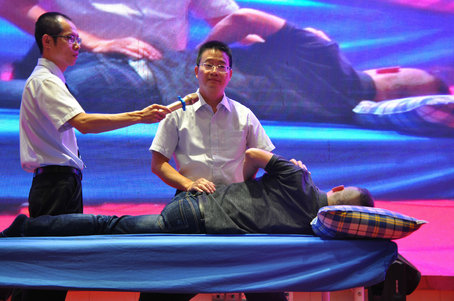 在“南少林醫(yī)武結(jié)合經(jīng)筋手法學(xué)習(xí)班”上,由中華中醫(yī)藥學(xué)會推拿專業(yè)委員會原秘書長、上海岳陽中西醫(yī)醫(yī)院沈國權(quán)、洛陽正骨醫(yī)院楊洸、四川省骨科醫(yī)院戴國鋼、海城市正骨醫(yī)院蘇紀(jì)權(quán)與泉州市正骨醫(yī)院陳長賢團(tuán)隊(duì),就泉州南少林正骨流派手法、一指禪推拿流派(海派推拿)、洛陽正骨、峨眉正骨、海城正骨等各流派手法,現(xiàn)場分享演示,讓學(xué)員領(lǐng)略到正骨手法的神奇療效。