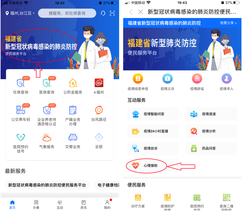 公眾可下載閩政通APP,點擊頭部“福建省新型冠狀病毒感染的肺炎防控”,進(jìn)入專題,點擊互動服務(wù)欄目中的“心理援助”,就可進(jìn)入心理援助平臺,進(jìn)行電話咨詢或網(wǎng)絡(luò)咨詢,工作時間均為每天9:00~22:00。