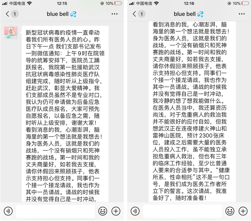 “真的很感謝父母的體諒,記得還在學(xué)校讀書(shū)的時(shí)候,爸爸就和我說(shuō),如果以后有這樣情況,要我積極報(bào)名,為自己也為需要的人做點(diǎn)事。感謝父母的養(yǎng)育,感謝學(xué)校的培養(yǎng),感謝醫(yī)院的栽培,我會(huì)不負(fù)眾望,平安而歸?!?/p>
