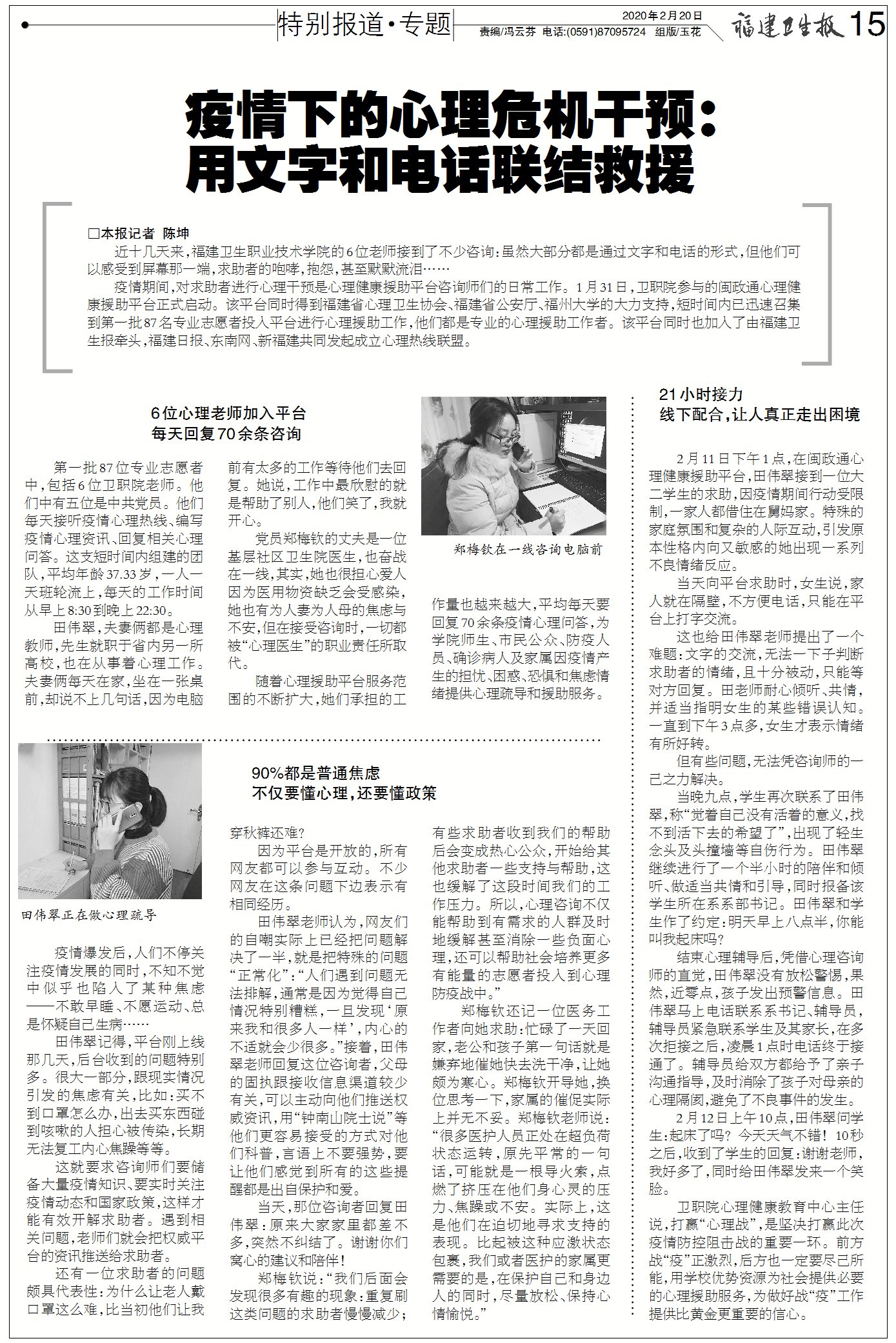 近十幾天來,福建衛(wèi)生職業(yè)技術(shù)學院的6位老師接到了不少咨詢:雖然大部分都是通過文字的形式,但他們可以感受到屏幕那一端,求助者的咆哮,抱怨,甚至默默流淚……