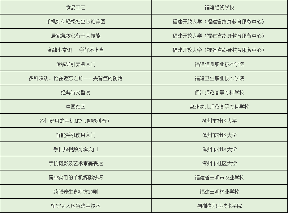 “智慧助老”優(yōu)質(zhì)教育培訓(xùn)項(xiàng)目中,漳州社區(qū)大學(xué)的《智慧生活你我他》等5個(gè)項(xiàng)目入選。