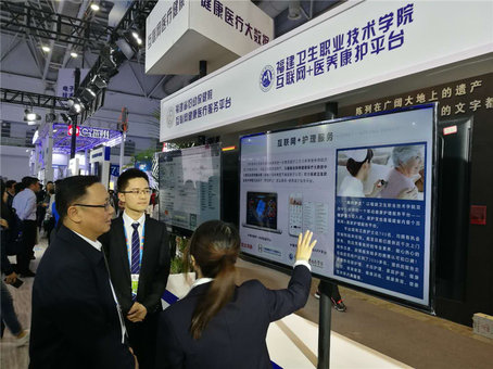 峰會現(xiàn)場7號館的國家衛(wèi)健委展區(qū),福建衛(wèi)生職業(yè)技術(shù)學(xué)院展出的互聯(lián)網(wǎng)醫(yī)養(yǎng)康護(hù)服務(wù)平臺