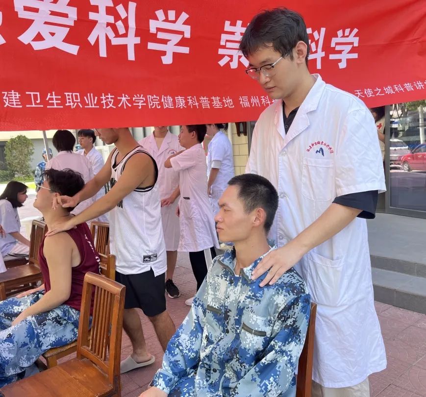 9月17日上午,福建衛(wèi)生職業(yè)技術(shù)學(xué)院20名志愿者在紅十字生命教育科學(xué)館門口開(kāi)展了校內(nèi)義診活動(dòng)。