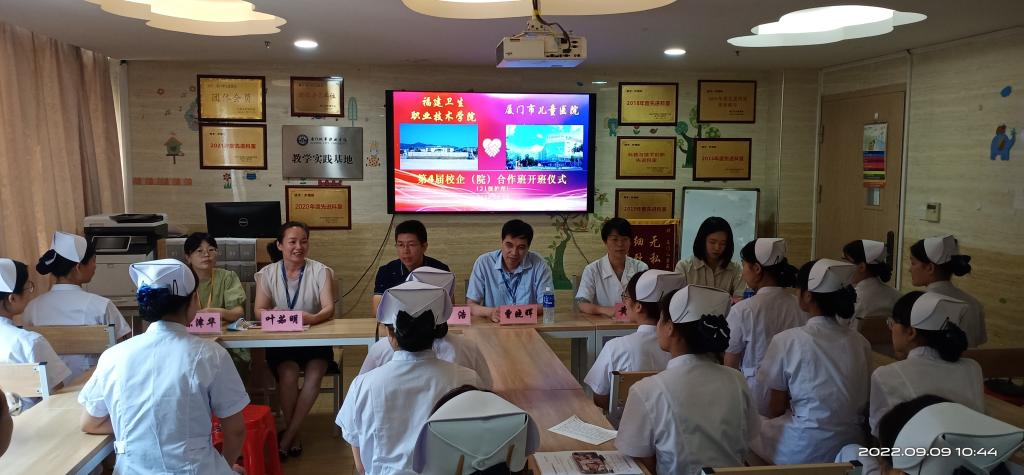 9月9日,護(hù)理學(xué)院與廈門市兒童醫(yī)院聯(lián)合開辦的2021級護(hù)理專業(yè)校院合作班在廈門市兒童醫(yī)院正式開班,廈門市兒童醫(yī)院副院長曾曉輝、辦公室主任(護(hù)理教研室主任)黃湘暉、護(hù)理部副主任葉茹明,我校護(hù)理學(xué)院副院長林浩,雙方有關(guān)老師、輔導(dǎo)員、班主任以及23名學(xué)生參加開班儀式。