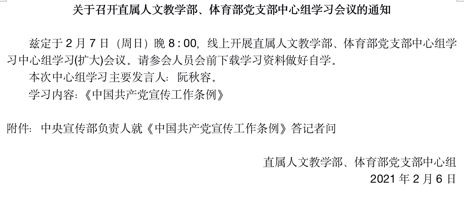 2月7日晚上,直屬人文教學(xué)部和體育部黨支部線上召開中心組學(xué)習(xí)(擴大)會議,專題組織學(xué)習(xí)《中國共產(chǎn)黨宣傳工作條例》(以下簡稱《條例》)和傳達全國宣傳部長會議精神,會議由直屬人文教學(xué)部和體育部黨支部書記阮秋容同志主持,人文教學(xué)部和體育部領(lǐng)導(dǎo)班子、直屬黨支部支委委員、系辦人員等參加了會議。