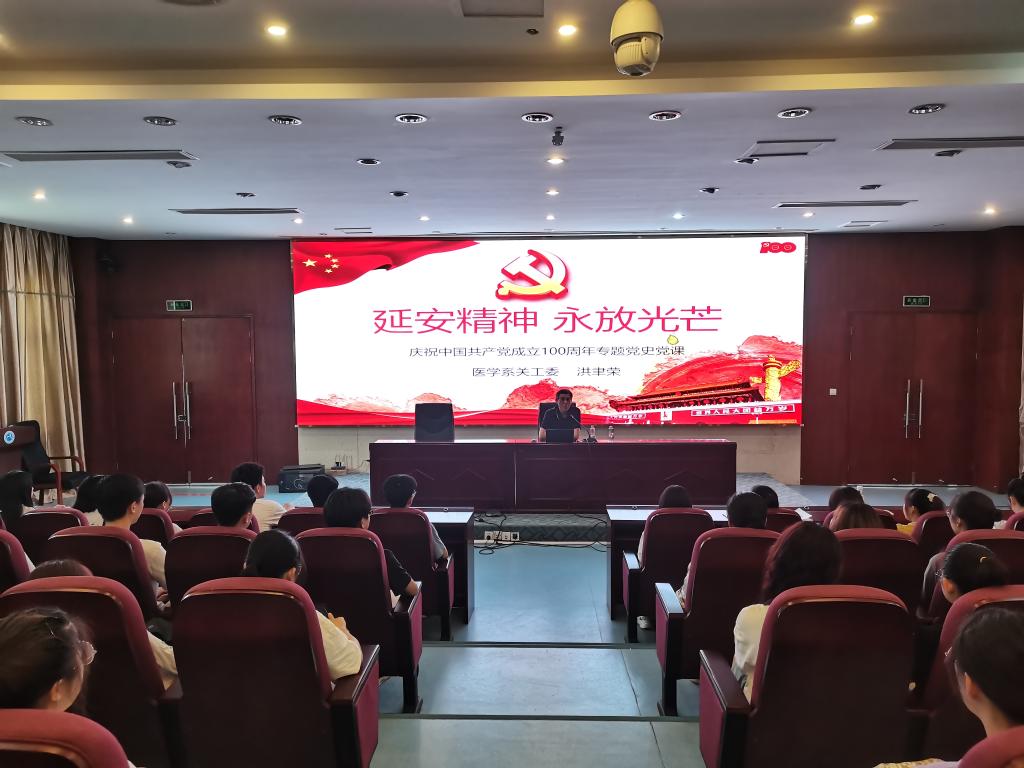 為慶祝中國共產(chǎn)黨成立100周年,2021年5月20日,醫(yī)學(xué)系黨總支邀請系關(guān)工委常務(wù)副主任洪聿榮為預(yù)備黨員、入黨積極分子等青年學(xué)子們講授《延安精神永放光芒》專題黨課。