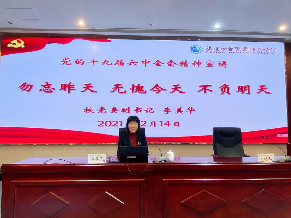為深入學習宣傳貫徹黨的十九屆六中全會精神,12月14日,校黨委副書記李美華為聯(lián)系班級學生和護理學院黨員教師共145人宣講黨的十九屆六中全會精神。