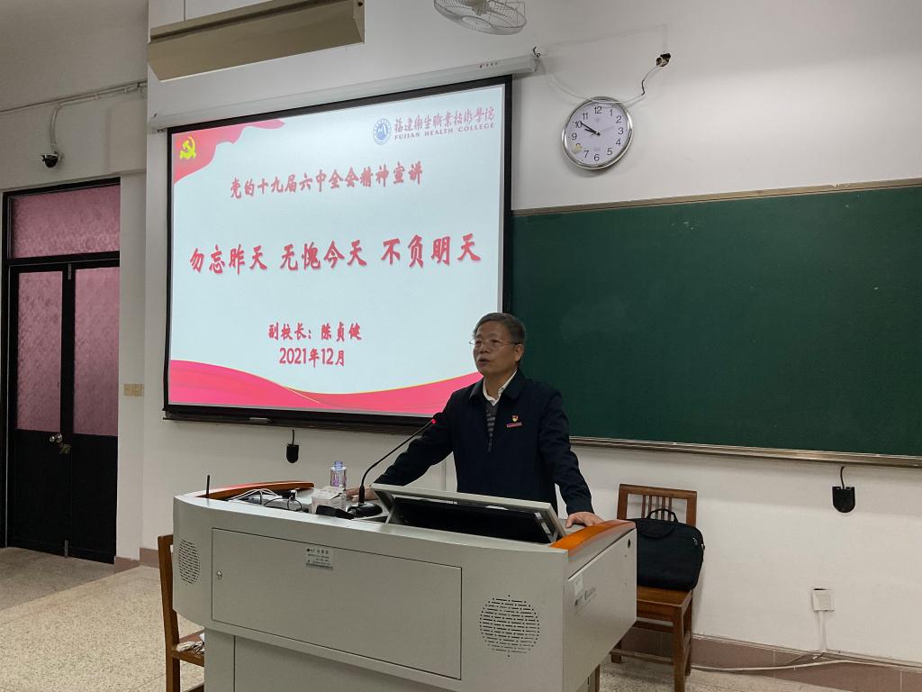 為深入學習貫徹黨的十九屆六中全會精神和福建省第十一次黨代會精神,12月17日上午,副校長陳貞健在教學樓110教室為21級美容專業(yè)105名師生宣講黨的十九屆六中全會精神。