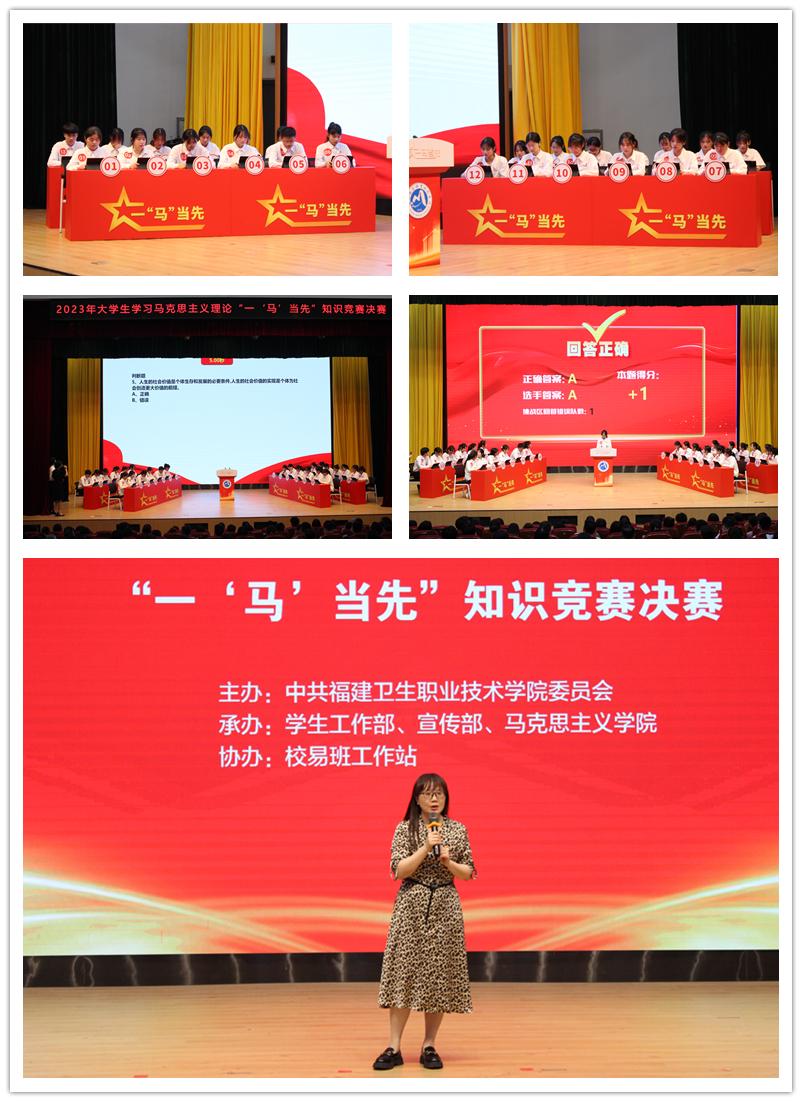 在深入開展學(xué)習(xí)貫徹習(xí)近平新時代中國特色社會主義思想主題教育之際,6月1日下午,由中共福建衛(wèi)生職業(yè)技術(shù)學(xué)院委員會主辦,學(xué)生工作部、宣傳部、馬克思主義學(xué)院承辦,校易班工作站協(xié)辦的福建衛(wèi)生職業(yè)技術(shù)學(xué)院2023年大學(xué)生學(xué)習(xí)馬克思主義理論“一‘馬’當(dāng)先”知識競賽決賽在學(xué)術(shù)報告廳舉行。校黨委書記曾武祈、黨委副書記李美華、副校長黃銘珊,學(xué)生工作部、馬克思主義學(xué)院、團(tuán)委、各院系相關(guān)負(fù)責(zé)人,輔導(dǎo)員及學(xué)生代表觀摩比賽。